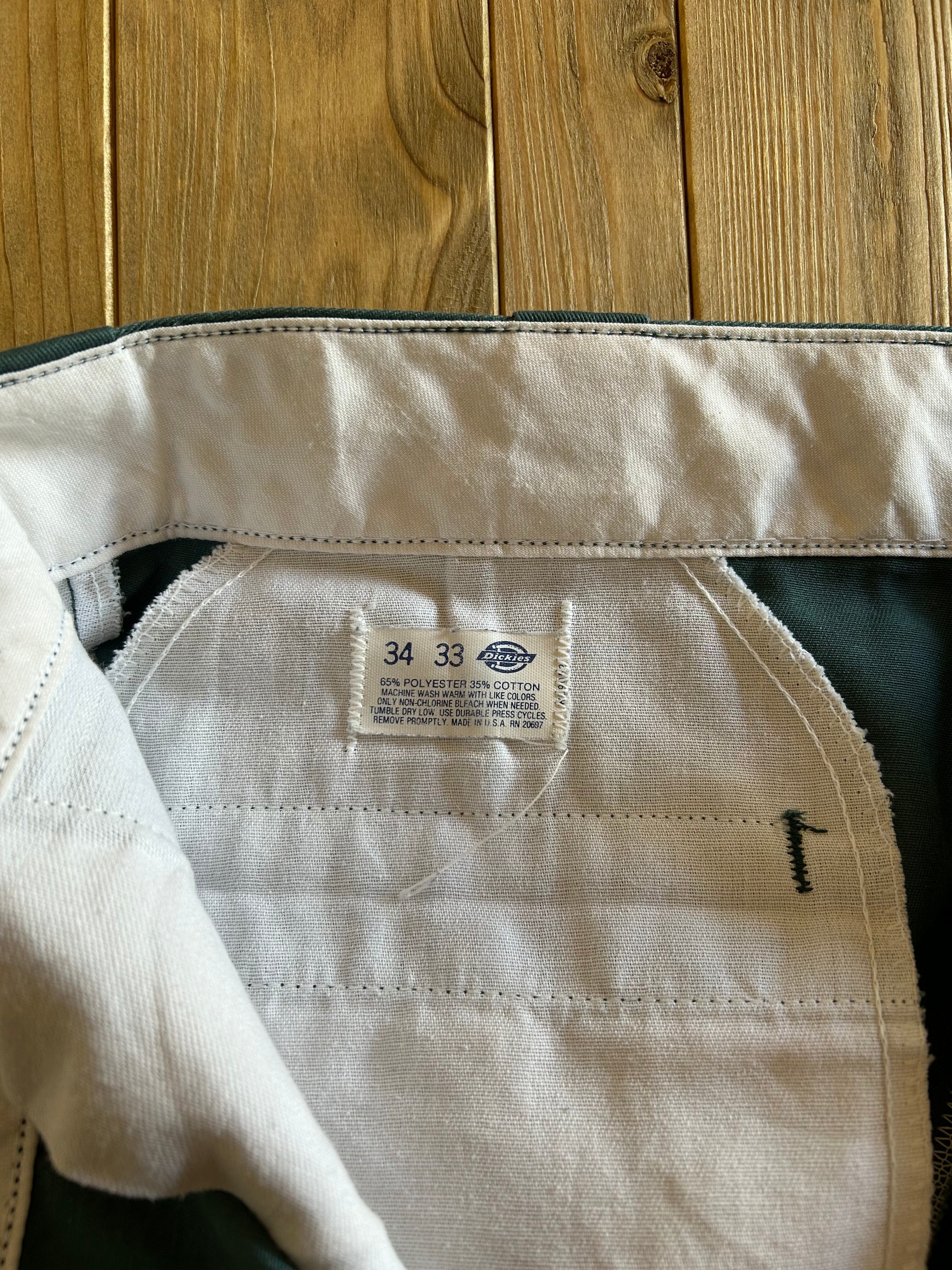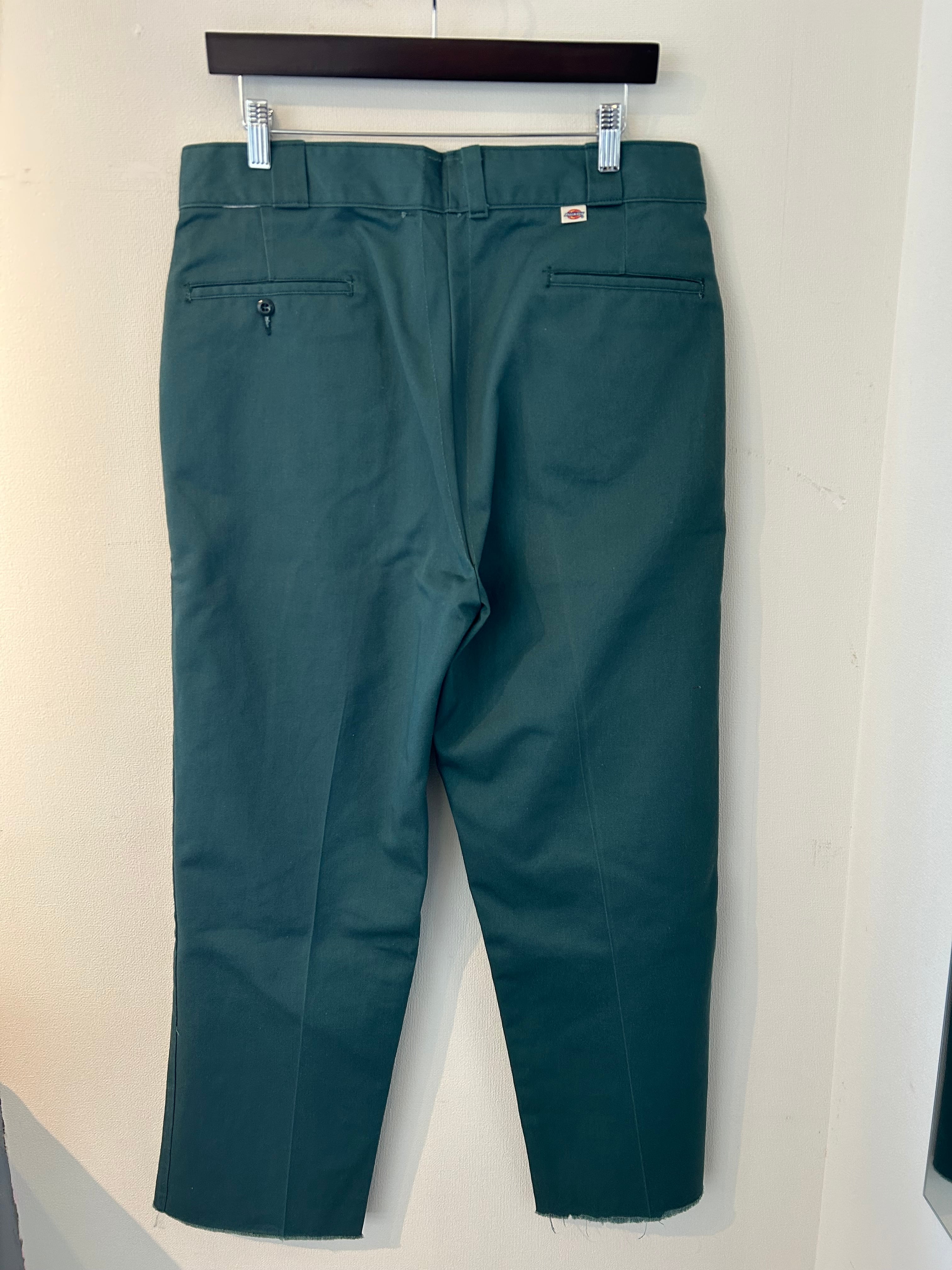 希少になりつつあるUSA製Dickies。チビタグ付きの80’sのワークパンツです。ウエストサイズが調整できるUSA製ですが、こちらはウエスト部分がほどかれています。また、裾はカットオフされた状態です。