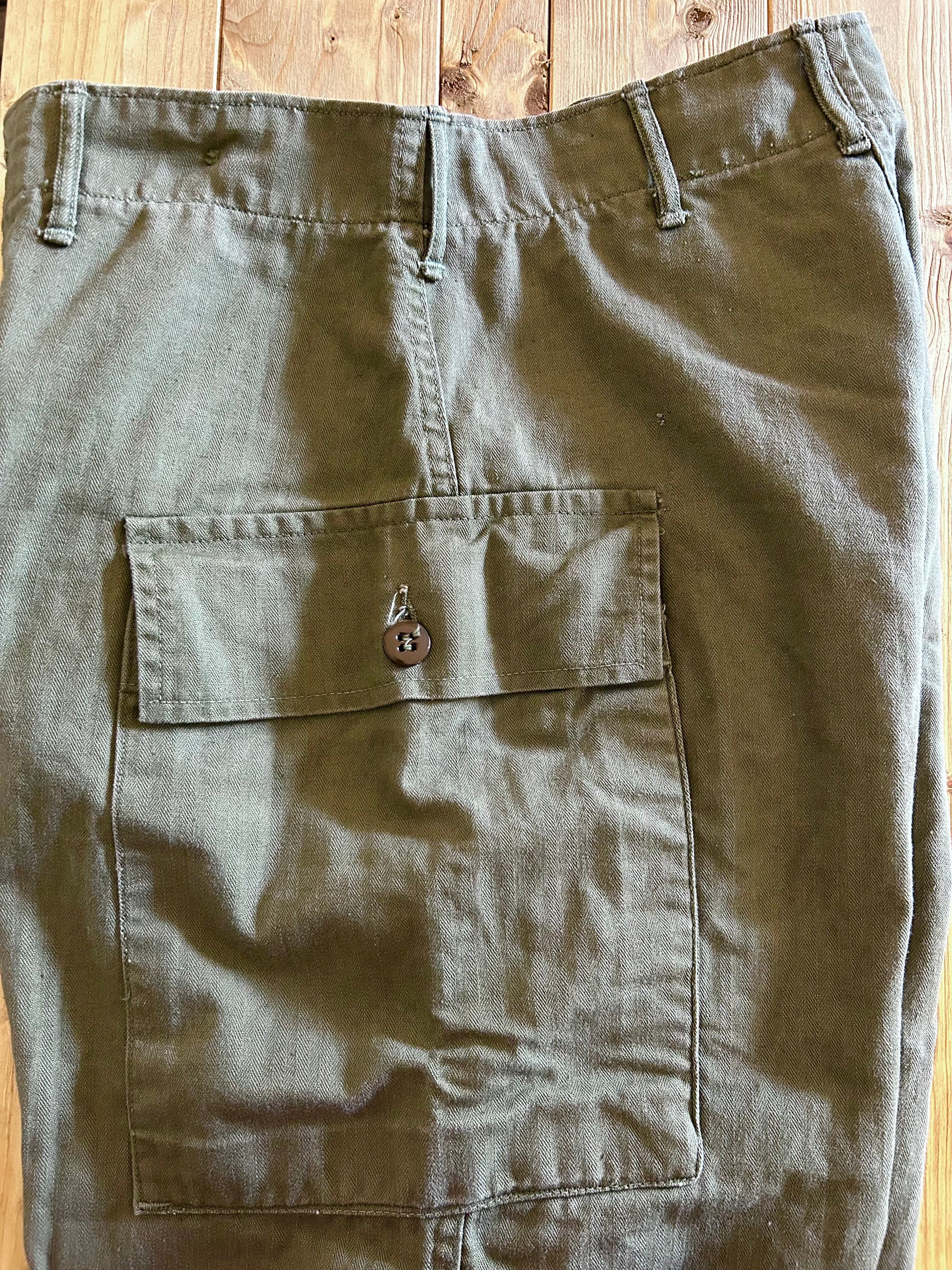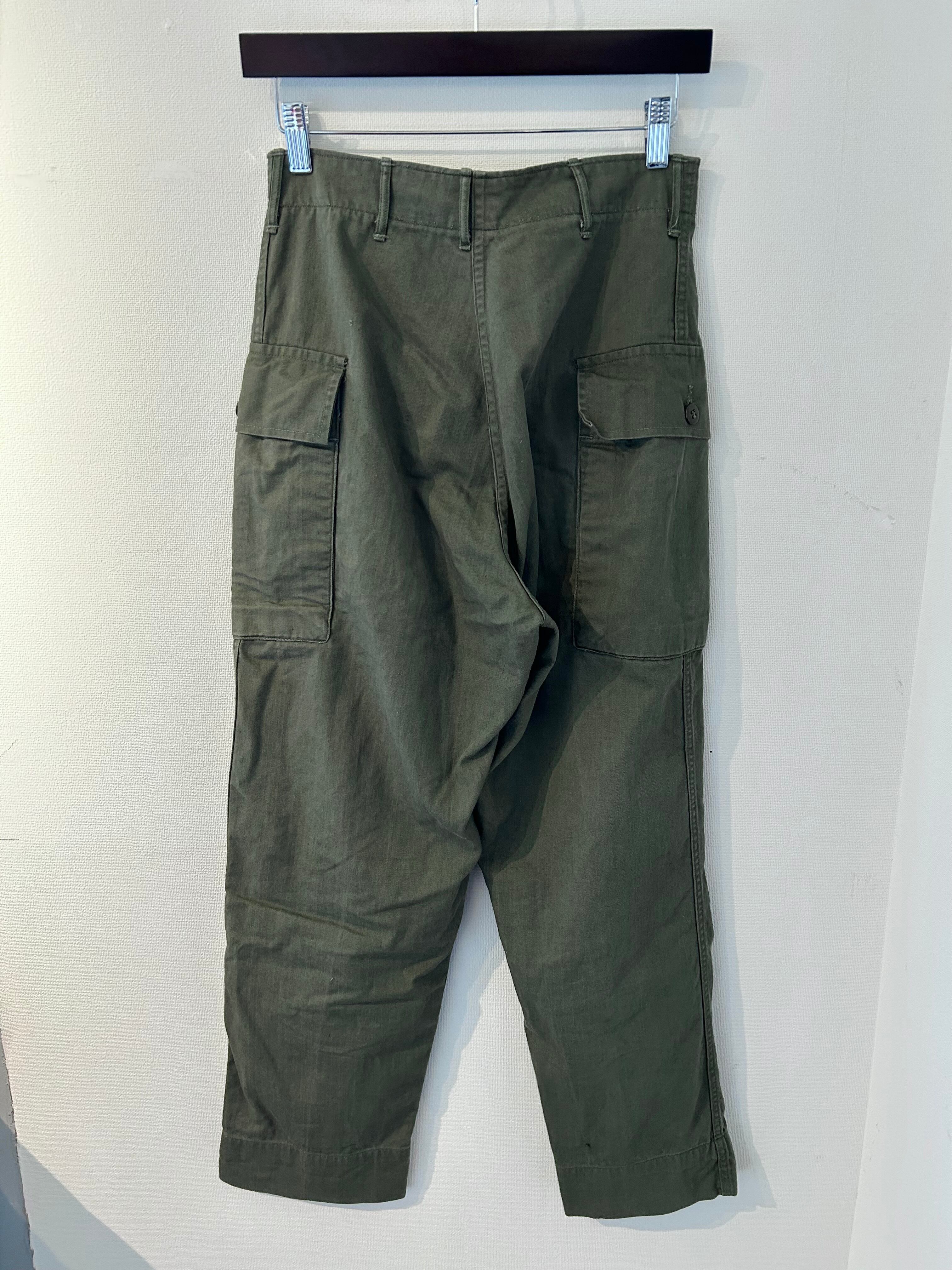 40’s US ARMY N-43カーゴパンツをリサイズしたものです。ウエスト幅、シルエットを細みにしたようです。裾もおそらく詰められています。ヘリンボーン生地が雰囲気あります。