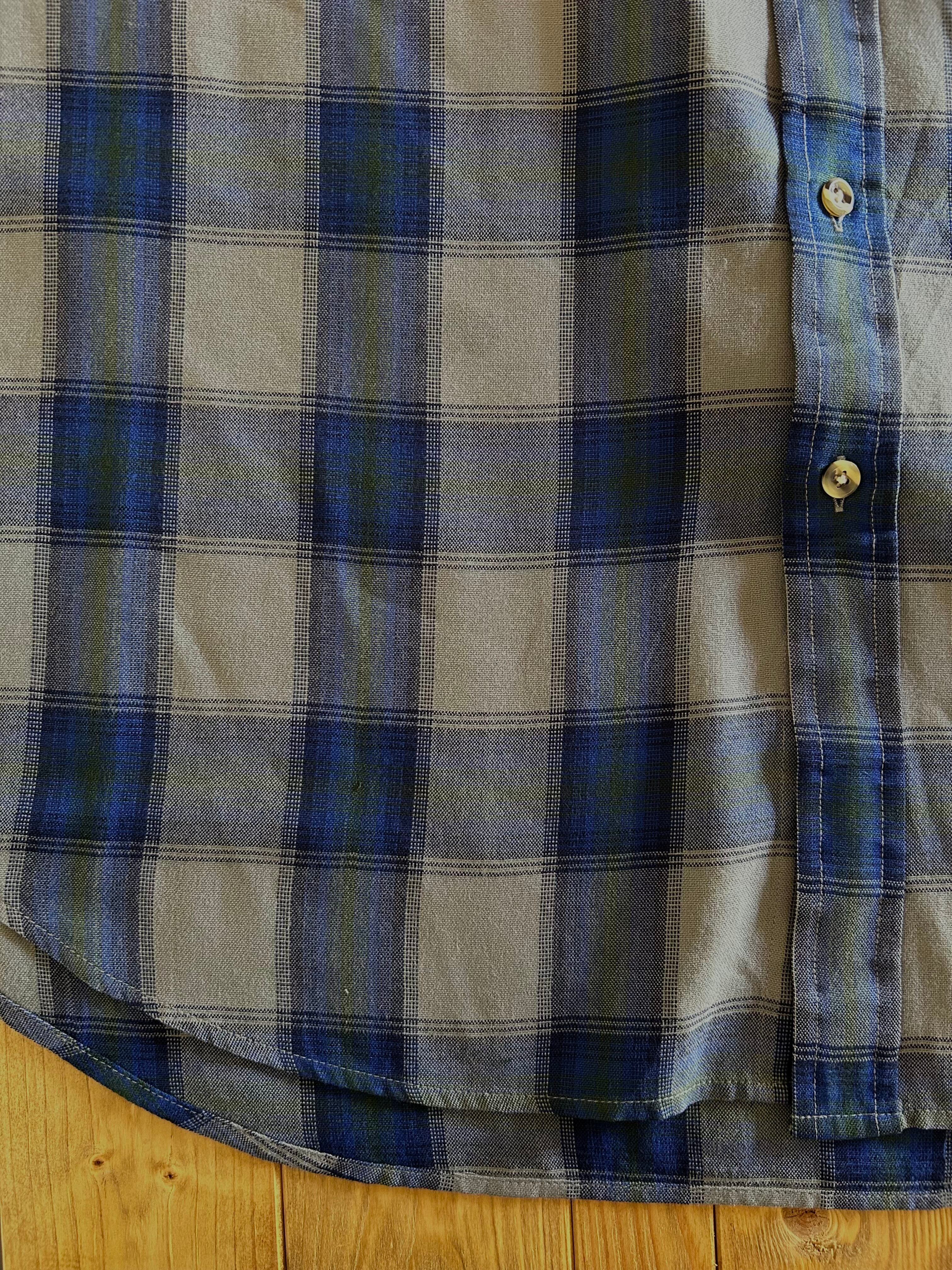 青とグレーのチェックがクラシカルな印象のシャツは落ち感のある素材でネルシャツとかはまた違った雰囲気が楽しめます。